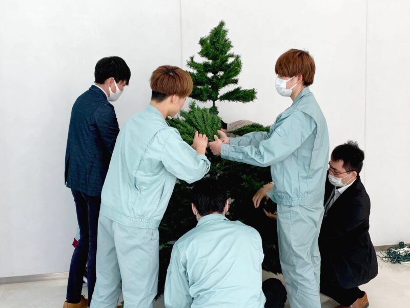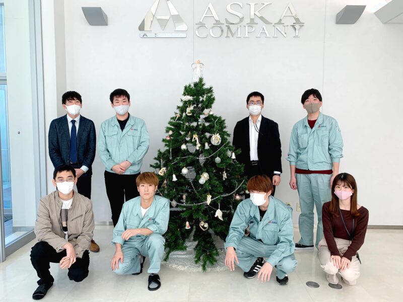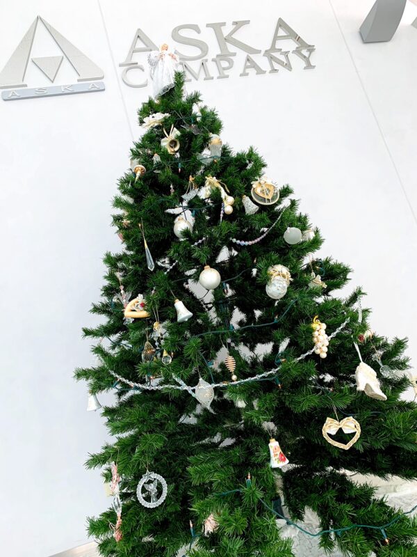 アスカでは、毎年新入社員が本社のクリスマスツリーの飾りつけを担当するというのが恒例になっています。