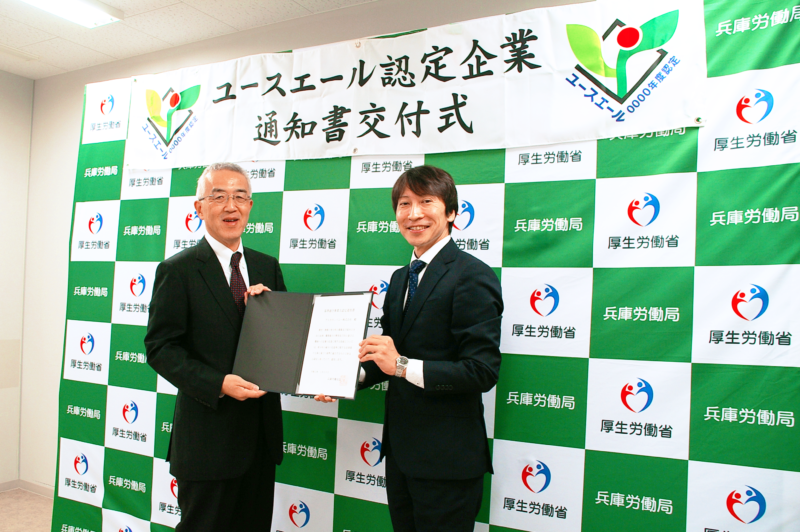 本日2/3(月)、ユースエール認定の「基準適合事業主認定通知書」交付式があり、兵庫労働局 職業安定部長様から認定書をいただきました。