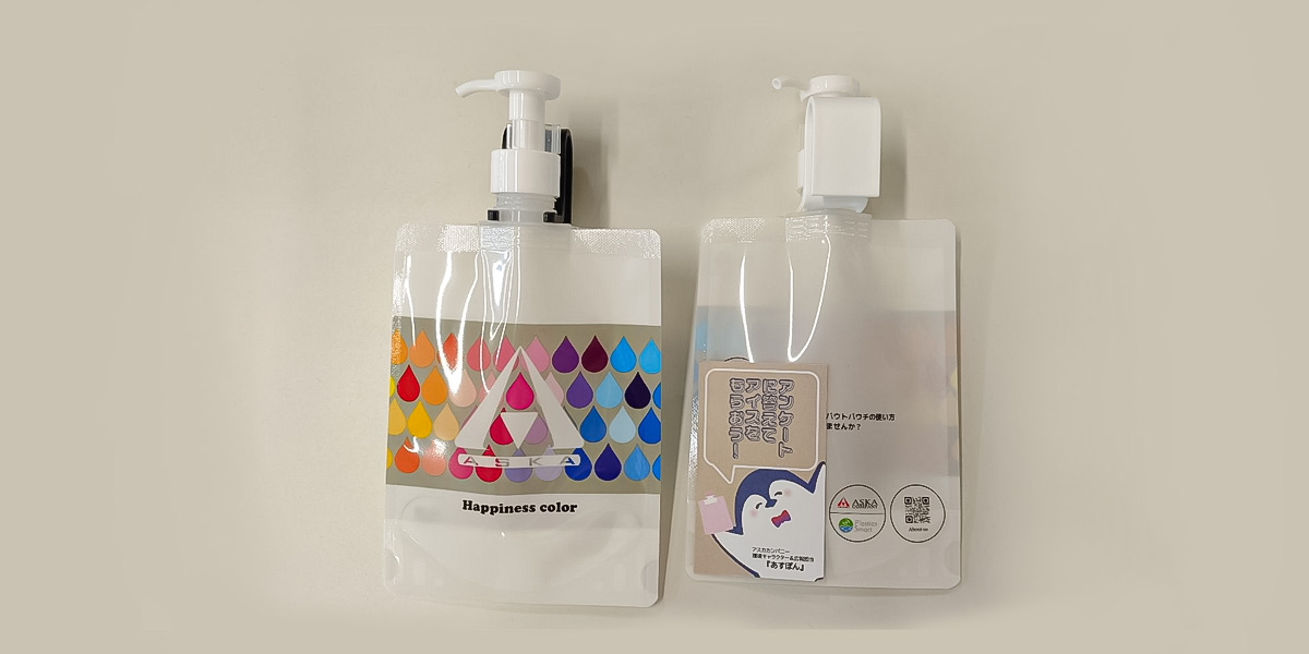 プラスチックの使用量が少なくリデュースに対応した環境に優しい容器である、弊社オリジナルのスパウトパウチ容器などを展示しました。