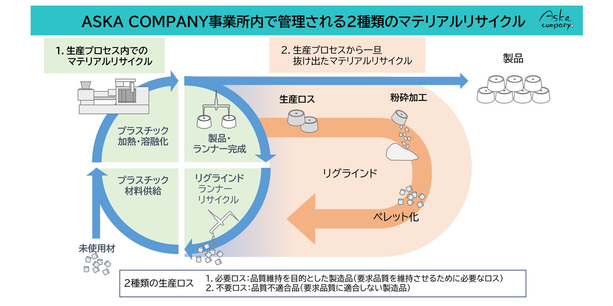 アスカカンパニー内で出たロス製造品を自社で粉砕など行い、トレーサビリティが確保された状態で、製品に戻すという取り組みです。