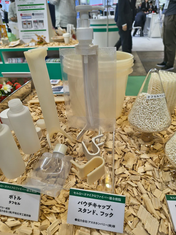 以前から注目されているバイオマスプラスチックをはじめとする植物由来のマテリアルや、生分解性を有するマテリアル、バイオマス資源の有効活用の展示も散見されました。