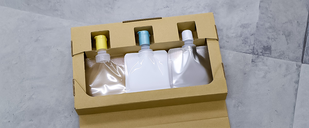 これらを「まずは1週間、しっかり使って効果を実感したい」というユーザーにとって、「少量でありながら、本製品と同じ世界観を持たせること」が可能なもの、それがミニサイズのスパウトパウチとなります。
