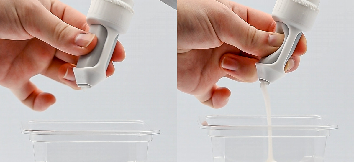ヒンジキャップの利点を活かし、片手でパカッと開け、使用後は手前に戻し、押し込むことで確実にリキャップ(再封)が可能です。