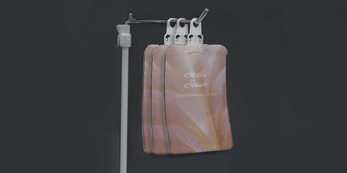 一般の什器に対応したΦ8mmの吊り下げ用の穴をスパウト自体にデザインし、この穴を使用して吊り下げが展示が可能です。