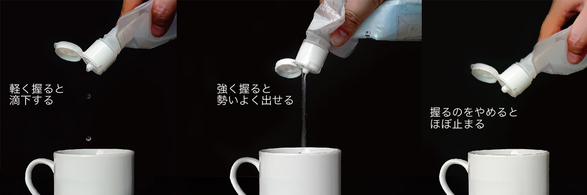 パウチをひっくり返すとぽたぽたとしずくが垂れるくらいの流量ですが、パウチを押すと多少多く出てくるように、もっと強く押すと大量に出すことも可能です。