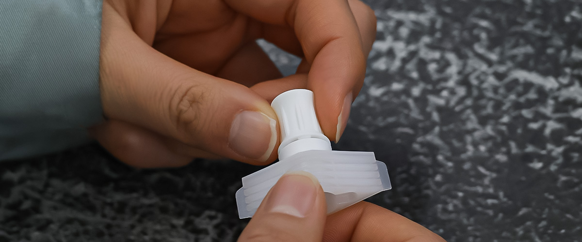 このキャップとスパウト自体の工夫によって、開けやすいスパウトパウチとなりました。