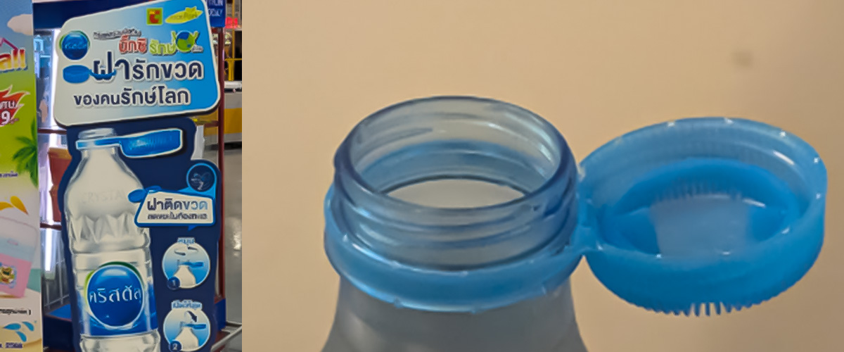離脱・廃棄対策としてPETボトルのキャップがヒンジ仕様になっている