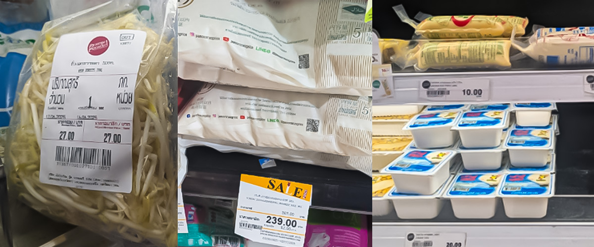 市場調査では、食品などもチェックしてみました。ちょうど日本ではお米の価格高騰がニュースになっていた頃だったので、タイの物価も気になるところです(当時1バーツは約4.3円程度)。