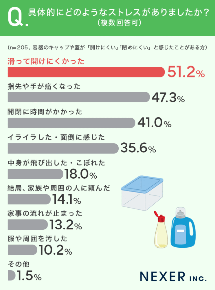 今回の調査では、約4割の方が容器の開閉に不便を感じた経験があり、そのストレスとして「滑りやすさ」「手の痛み」「時間がかかる」が上位に挙げられました。