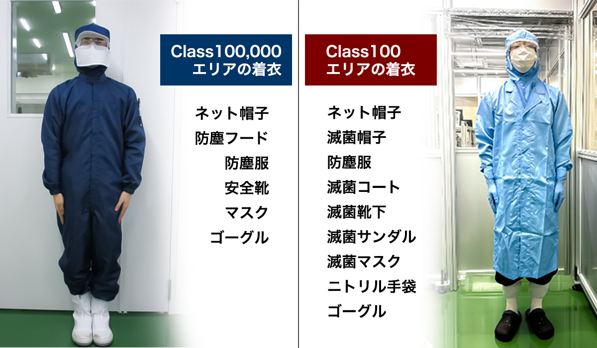 この高いクリーン度を維持するためには、入室するスタッフの服装管理も欠かせません。