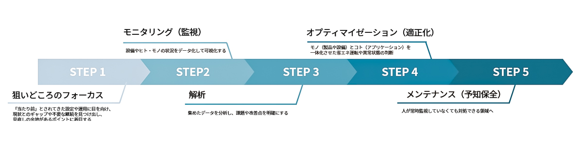 ただ、すべての案件が必ずSTEP5 『メンテナンス(予知保全)』まで到達する必要はなく、課題や目的に応じて取り組む範囲を見極めることが重要です。